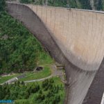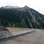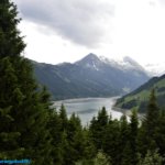 A Hütte-ben megebédeltünk (leves 2x + Wienersnitzer megfelezve + tea + 6.db. képeslap = 40€), mire befejeztük az ebédet elált az eső, így végül tudtam néhány használható képet is készíteni a gátról és a víztároló környezetéről is. Szemben a Hüttével, a tó végében egy havas hegy, szokatlan a mi szemünknek, júniusban.