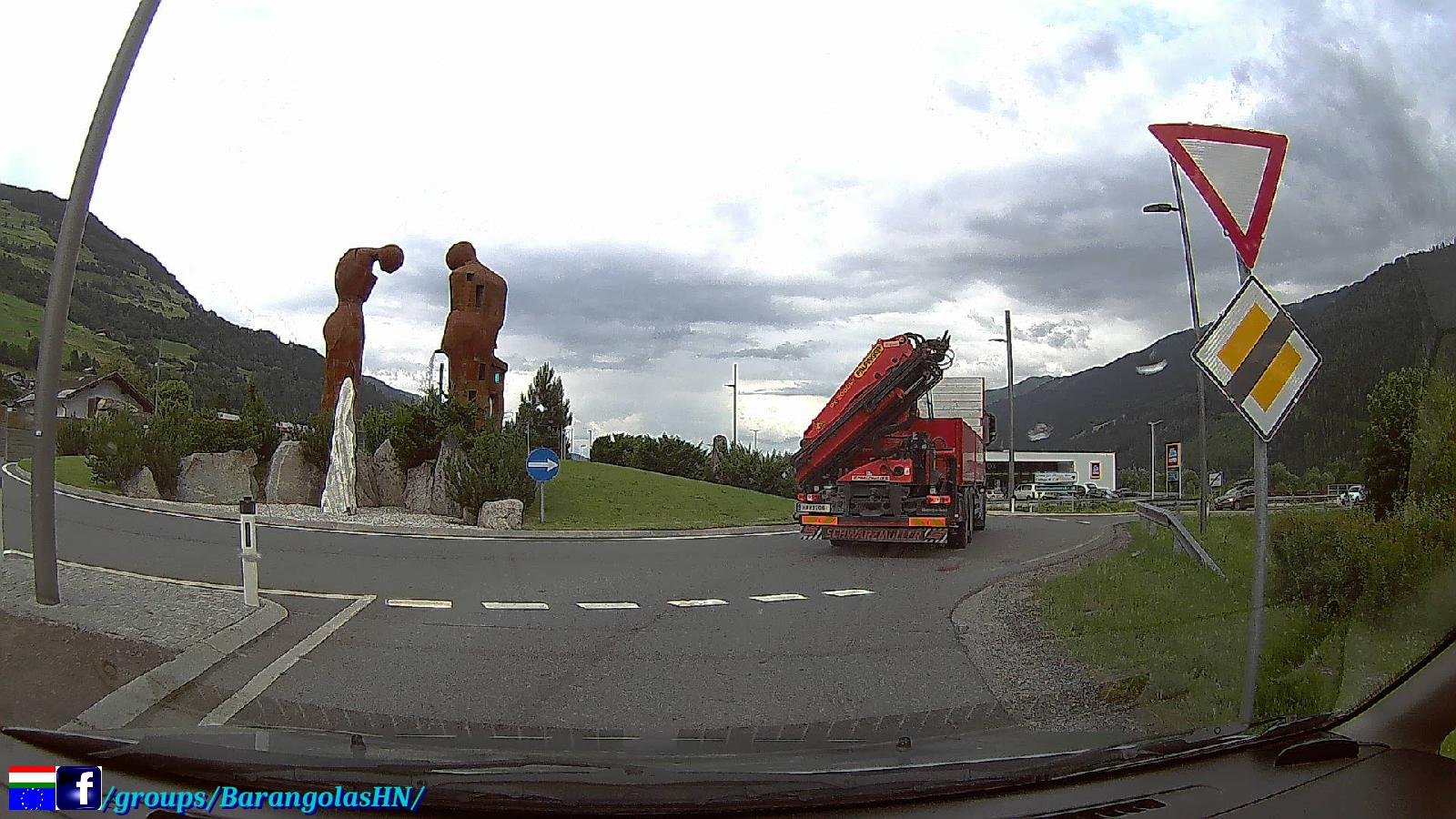 További utazásunk eseménytelenül folytatódott (leszámítva az esőt), na jó legyen még itt egy kép Mittersil körforgalmáról, találgassatok mit ábrázolhat e szokatlan alkotás (a megszokott virágos körforgalmak helyett).
