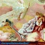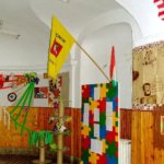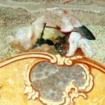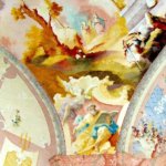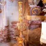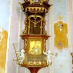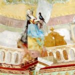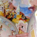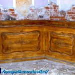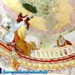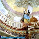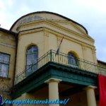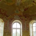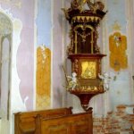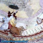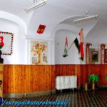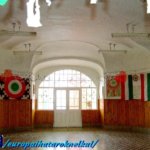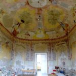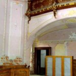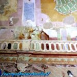 Az emeleten van a díszterem, belépve a terembe elszörnyedtünk a látványtól, lepusztult falak, melyeken egykor szép freskók voltak, ma már ez néhol már csak nyomokban látható, a falazat málik, a fal körül a földre téve halomban könyvek.