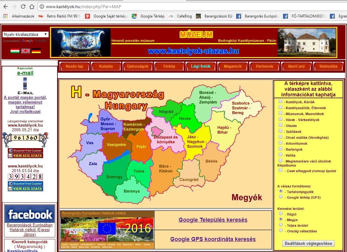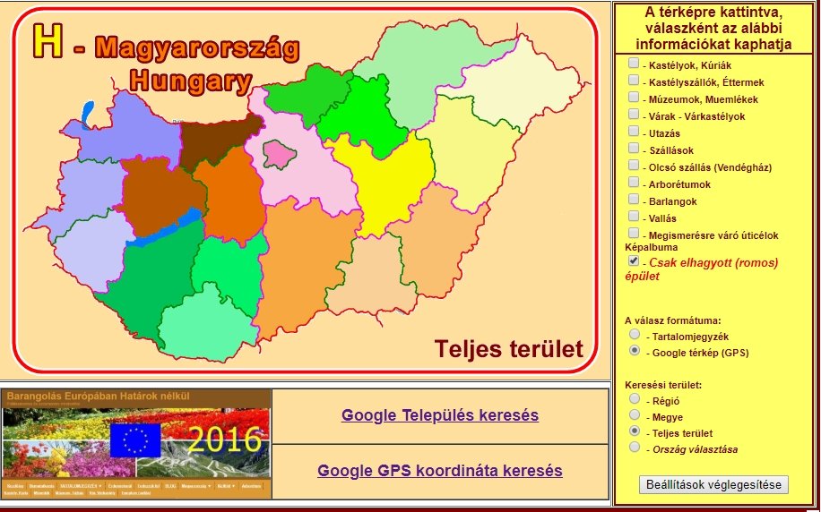 Elkezdtem a Google “Saját térkép” lehetőségét kihasználva térképre felvinni az általam ismert helyeket, nagyon sok időt fordítottam rá, de ennek létrehozása, karbantartása, aktualizálása nagyon sok időt (energiát) emészt fel, rájöttem, hogy értelmetlenül, hiszen nagyon sok információval rendelkezem az adatbázisomban, csak ebben való keresést és megjelenítést kell megreformálnom, és máris helyettesíteni tudom a “Saját térkép” rendszerét, így ezt mostantól abba is hagyom, sőt törölni is fogom.
