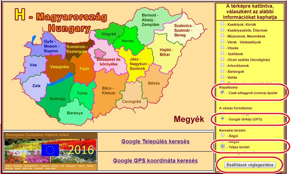 A térképes megjelenítés csak azokra a helyekre lesz elvégezve, amiknek a földrajzi koordinátái (GPS) általam már ismert, azaz berögzítettem már az adatbázisomba. Az adatbázisban már szereplő, de GPS koordináták helyeinek hiánya esetén ezek nem kerülnek felhelyezésre a térképre, ha teljességet szeretne látni, akkor a Google térkép helyett a “Tartalomjegyzék” megjelenítési módot javaslom, ebben minden hely, ami az adatbázisomba már bekerült, meg fog jelenni. A Google térképes megjelenítés akkor célszerű, ha eg útvonalra eső, vagy valami közelében lévő helyeket keres, ezen a térképen vizuálisan jól láthatóak a helyek elhelyezkedései.
