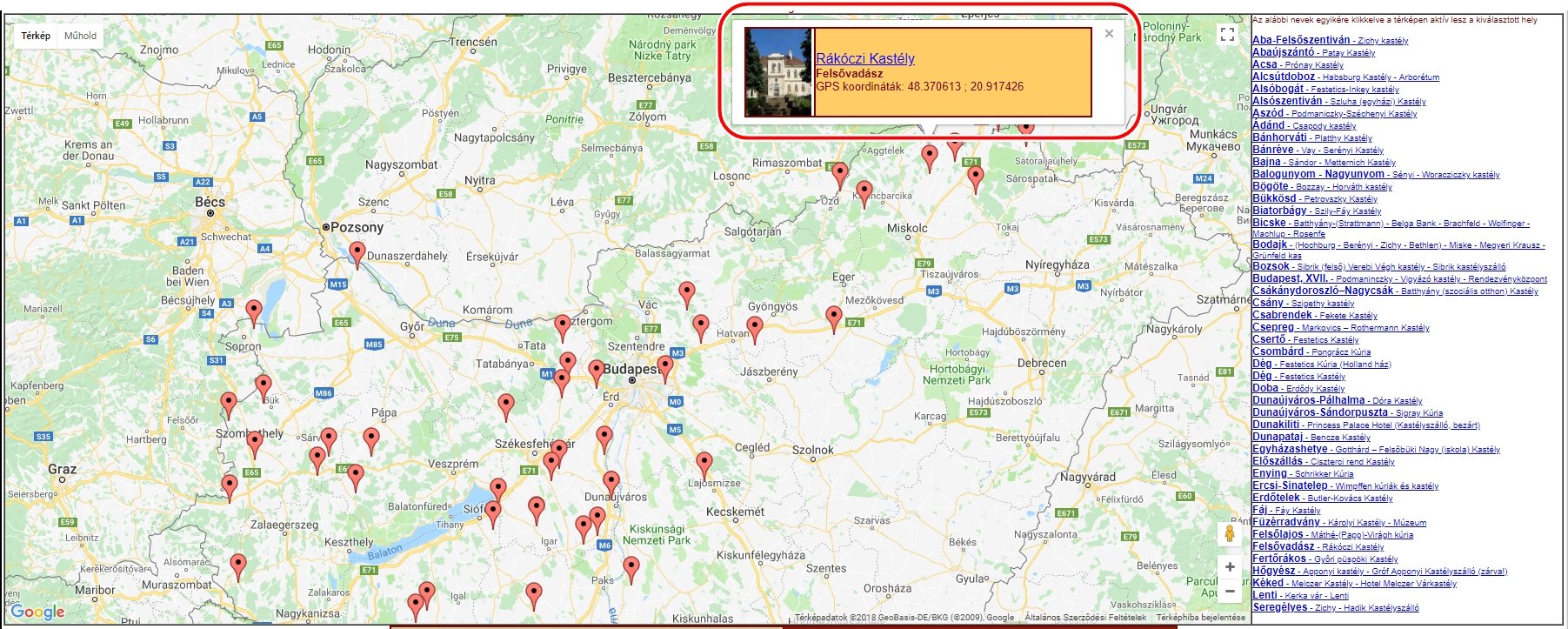 A bal oldalon a Google térkép lesz látható, felhelyezve rá a keresésnek (szűrés) megfelelő helyek jelölői (földrajzi helyüknek megfelelően), ha egy jelölő fölé mozgatja az egeret, megjelenik a hely adatlapja, a jobb oldalon pedig helységnév sorrendben az adatlapokhoz tartozó LINK-ek, bármelyikre klikkelve, a térképen aktiválódik az adott hely adatlapja.