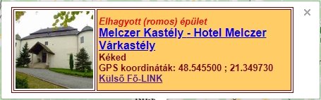 Egy másik momentum is közrejátszott a megvalósításban, látom, hogy hatalmas az érdeklődés a romos épületek/kastélyok/kúriák iránt. Ugyan nem értem az okát, sőt meg sem akarom érteni, mert számomra a jó állapotban lévő/látogatható érték elsőbbséget élvez, de meghajlok az igény előtt. Az adatbázisomban benne van minden kastély/kúria, csupán egy épület jellemzőt kell hozzávinnem és máris teljesítve van az igény, az adatbázist felbővítettem, el is kezdtem az épületek jellemzőjeként a jelző beállítását, úgy gondolom, hogy 1 hét munkával a jelző a teljes adatbázisra beállítható, és máris kereshető, kutatható az adatbázis.